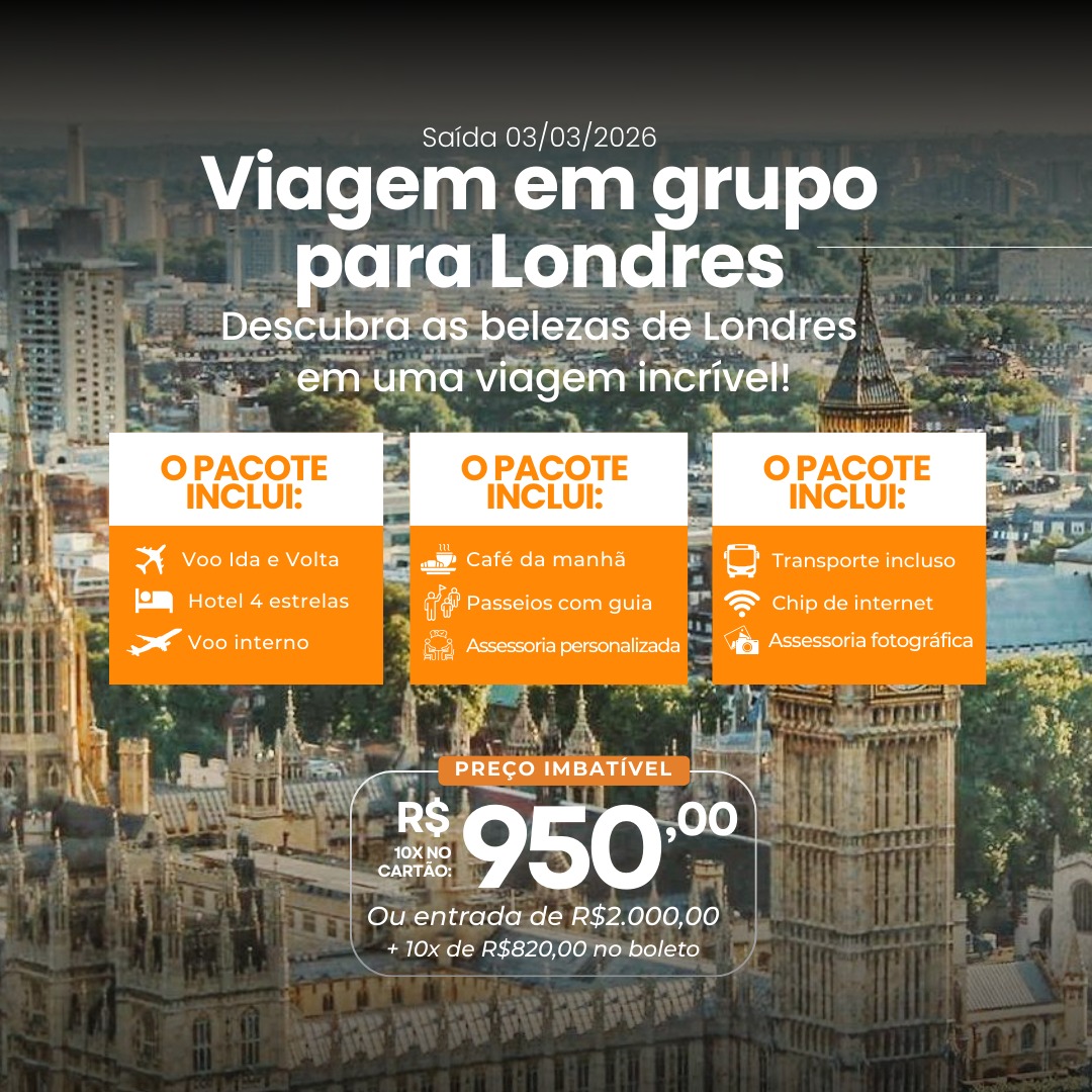 Com mais de 6 anos de experiência vivendo no Reino Unido, David de Andrade Pereira é referência em turismo personalizado, oferecendo um serviço completo e com excelência. Ao longo de sua trajetória, já viajou por mais de 15 países e se tornou especialista em roteiros sob medida, cuidando de cada detalhe: da passagem aérea ao último transfer.